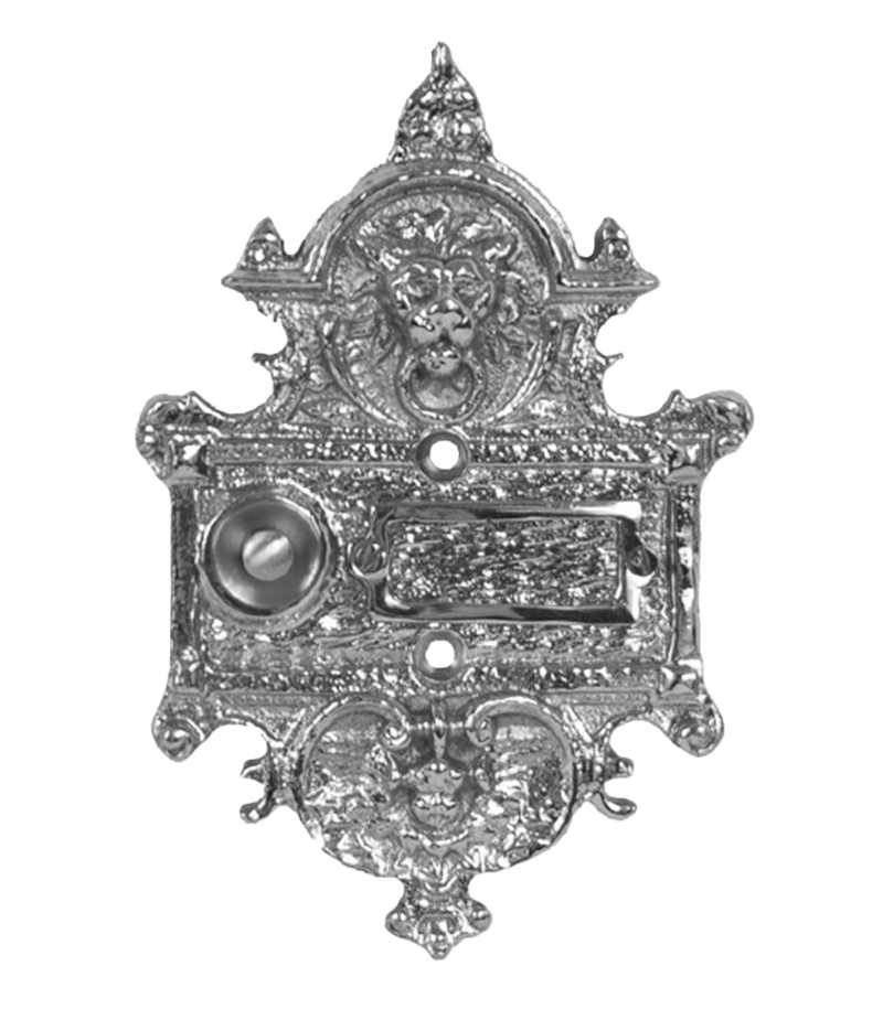 Sehr repräsentative Klingelplatte im Gründerzeit- / Jugendstil für 1 – Haushalt. Aus massivem Messing in traditioneller Handarbeit hergestellt. Sehr detailliert gearbeitet. Besonders beeindruckend ist der plastische Löwenkopf im oberen Bereich der Klingelplatte.