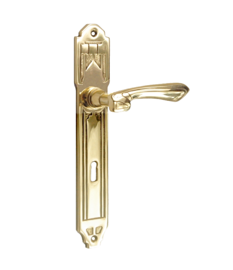 Eindrucksvolle Türdrücker-Garnitur im Gründerzeit / Barock Stil aus massivem Messing in traditioneller Handarbeit gefertigt. Besonderes schön ist das geschwungende  Langschild und der wunderschön verzierte  Türgriff . Ein absoluter Blickfang !!!