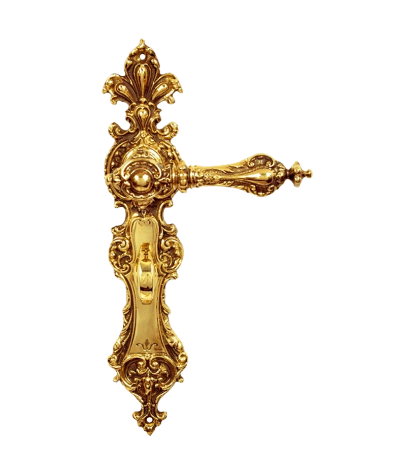 Eindrucksvolle Türdrücker-Garnitur im Gründerzeit / Barock Stil aus massivem Messing in traditioneller Handarbeit gefertigt. Besonderes schön ist das geschwungende  Langschild und der wunderschön verzierte  Türgriff . Ein absoluter Blickfang !!!